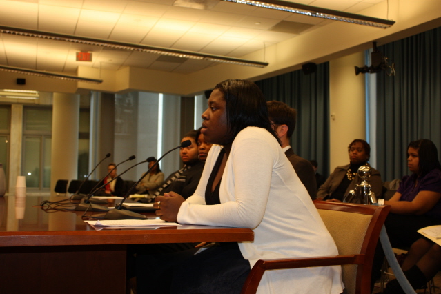 (PHOTO: Courtesy of Young Women's Project) Foster youth, T'Kara Plater, testifies.